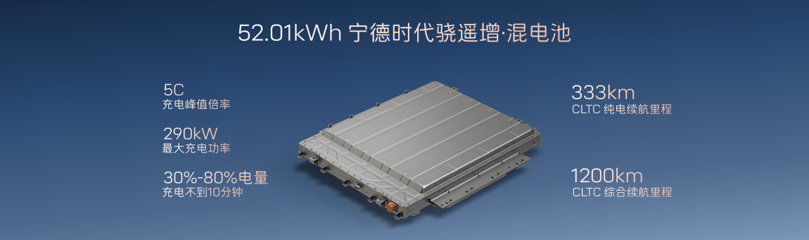 同时,配备宁德时代骁遥增·混电池。超过440Wh/L的电芯体积能量密度,助力纯电续航拉升至333km,支持5C超充。